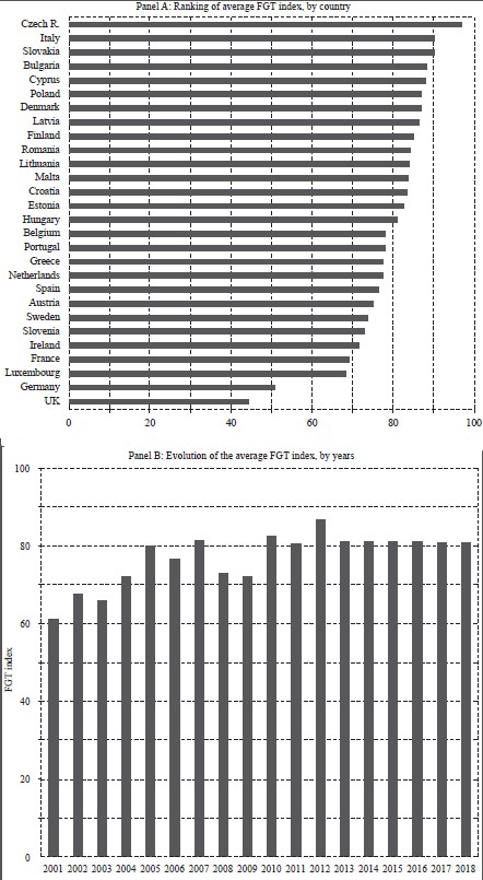 Figure 1, panel A shows the ranking of FGT by country, while Panel B shows the evolution of the FGT index over the sample years. The country rankings may appear surprising at first, given the relative position of some large economies at the bottom of the table. While no attempt has been made to evaluate the degree to which the FGT index overlaps with alternative transparency measures, some comments can be made based on the data collection process. In particular, the low transparency score on the UK does not necessarily reflect a scarcity of data in the Convergence Programme that the country has published over the years. Rather, the score is explained by the fact that the Convergence Programme of the UK has, for many of the initial years of the SGP framework, reported most forecasts using definitions and measurement criteria inconsistent with those required by the applicable CoC. Indeed, it was not uncommon for the UK to publish only the Maastricht debt and deficit required under Regulation 1466/97, while not disclosing the ESA-compliant breakdown of these figures. As a result, many UK Convergence Programmes are characterized by limited FGT scores. The case of Germany – also a relatively low scorer – is somewhat different. In the case of Germany, in many years the government chose to publish forecasts on several prominent items in the form of averages that cover multiple forecast horizons. Accordingly, while an average forecast often existed for the entire period t-t+3, it was counted as missing when constructing the FGT index because the averaging of annual, point forecasts is forbidden under the CoC as it leads to a loss of information from the point of view of users (see section 3.3).