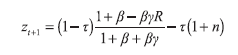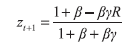 Solving equations (5) and (6) for st and zt+1 and substituting them into equations (2) and (3), we obtain equations (7)-(10) as follows.  | (7) |