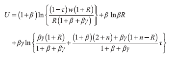 For the first term, if the population growth rate is higher than the interest rate, i.e. 1 + n – R > 0, the potential lifetime disposable income, which is the right-hand side of the above equation (16), can be increased by introducing the pay-as-you-go scheme. This increase in the potential lifetime disposable income leads to an income effect that increases leisure and reduces labour supply, which we will call the Aaron effect.