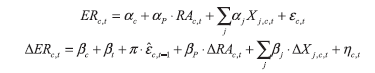 Grouping together the country and year fixed effects and the control variables Xj,c,t in equation (3), which for a given country at a given year are constant, in the constant θ0, the model can be rewritten in the following way:  |