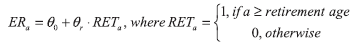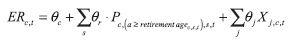 where θc is a country fixed effect, θr is the retirement age effect, Xj are a set of control variable variables of interest and θj their associated coefficients. Consequently, the employment rate of population is assumed to remain constant at  ntil the year before the retirement age when it falls by θr percentage points.