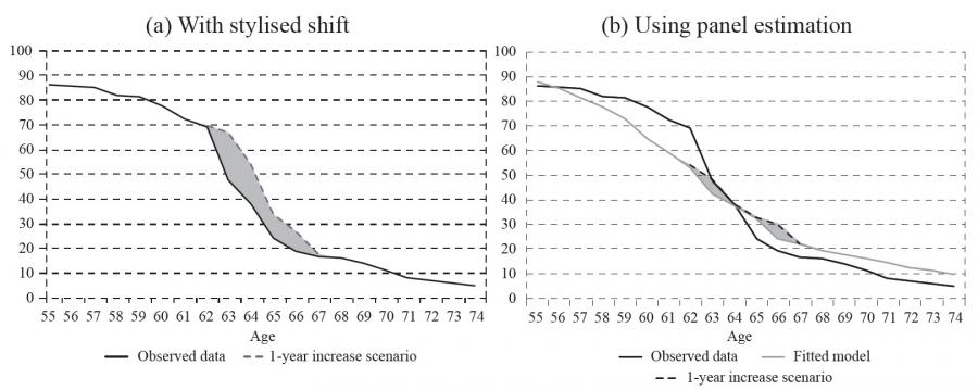 Before a further estimation to try to resolve these apparent contradictions, it is helpful to visualise the problem with a concrete example. A rough estimate of the effect of a change in statutory pension ages can be gauged by considering a stylised shift in the age-participation profile. For some countries, there is a pronounced drop in labour force participation between the minimum age of retirement 1 and the normal age of retirement, 2 as illustrated for the case of German men in figure 1, panel A. For the purposes of a stylised calculation, it is assumed that an increase in statutory pension ages by one year simply shifts the age-participation profile between these two ages by one year (as illustrated by the dashed line in figure 1, panel A). This is achieved by assuming that: participation rates at each age before the original minimum retirement age remain unchanged; for subsequent ages, the percentage change in the participation rate between each age and the following one is shifted up one year; and participation rates after the new normal retirement age remain unchanged. The total increase in the participation rate from such a stylised calculation, represented by the shaded area in panel A, is equivalent to an increase in the participation rate of the group aged 55-74 of 2.1 percentage points, and translates into an increase in the average retirement age of 5.1 months.This stylised calculation can be compared with the effect of an alternative computation using the baseline model fitted by pooled economic estimation in Geppert et al. ( 2019), (figure 1, panel B). Firstly, it should be noted that the fitted model from the pooled estimation implies a more gradual fall in participation than the more sudden drop from the minimum retirement age in the actual data. Then, applying the policy shock of increasing statutory pension ages results in a more modest shift in participation, equivalent to an increase in the participation rate of the age group 55-74 of 0.7 percentage points, equivalent to an increase in the average retirement age of only 1.5 months. The much larger (more than three-fold) increase from the stylised calculation compared to using the pooled econometric estimate is illustrated by the shaded area being much larger in panel A than panel B.