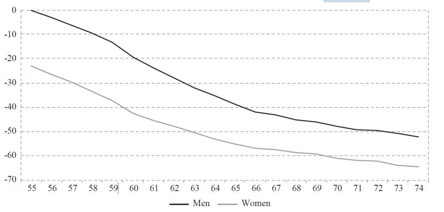 8 The assumption that ‘other explanatory variables’ are unaffected by the pension reform is a convenient simplification here. In the equations estimated in the full paper there is also an effect on participation from pension wealth and if the age-profile of pension wealth also shifts (as is likely) following a reform, then there will also be an effect from this channel. This second wealth channel is quantified in Table 2 and in all calculations reported in the main paper, but not included in the algebra here, both because it is country-specific and because on average the effect on the participation rate and average age of retirement is relatively small. For example, for the baseline model (equation 1 in Table 1), considering the effect on the average age of retirement from raising statutory pension ages by one year: the effect coming from the statutory retirement dummies alone is 1.6 months, but including an additional effect from pension wealth (assuming the age-profile is shifted up one year) only increases this estimate to 1.8 months.