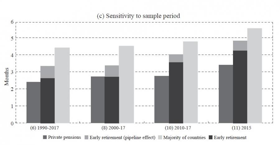 Shortening the sample estimation period – from 1990-2017 to 2000-17 to 2010-17 and to a single year 2015 – further increases the estimated coefficients on statutory pension ages (figure 3, panel C; and a comparison of equations (6) to (11) in table 1). The implied effect on the average age of retirement from a one-year increase in statutory pension ages rises for all country groups identified in the estimation as the sample period is shortened, but by most for the early retirement countries. 7 Thus shortening the sample estimation period from 1990-2017 to 2010-17, raises the average age of retirement effect from 4.4 to 4.7 months for the majority of countries, but from 3.3 months to 4.0 months for early retirement countries, and only from 2.4 to 2.7 months for private pension countries.