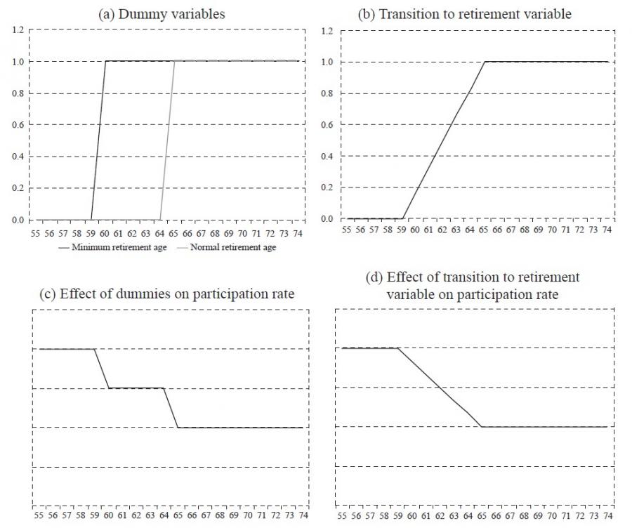 A4 Using a transition-to-retirement variable instead of dummies Suppose instead of defining dummies at the minimum and normal retirement ages a transition-to-retirement age variable is defined to be zero before the minimum retirement age, unity above the normal retirement age, so that: