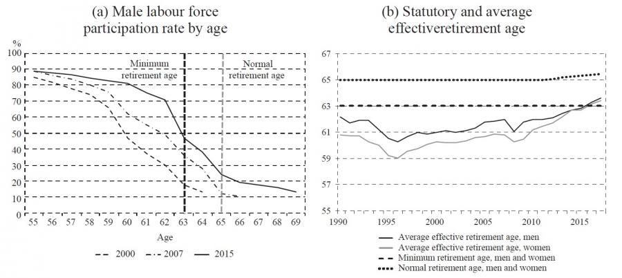 In summary, the results from cross-country panel regressions consistently imply that the statutory retirement age has only a rather modest effect on the average effective retirement age, which would seem to be at odds with the importance usually given to pension reforms. These findings of modest effects also seems to be contradicted by quantifications based on pension reforms in individual countries. Siebold (2019) analyses the concentration of retirements around statutory ages in Germany and concludes that “an increase in the normal retirement age from 65 to 66 is predicted to lead to an increase in average actual retirement ages by 4 months”. Mastrobuoni ( 2009) discusses a policy change in the United States that increased the normal age of retirement from 65 to 67 and raised the penalty for claiming retirement benefits before then, concluding that an increase in the normal retirement age by 2 months delays effective retirement by around 1 month. Staubli and Zweimüller ( 2013) analyse pension reforms in Austria that increased the early retirement age from 60 to 62 for men and from 55 to 58 for women, concluding that this increased employment by 10 percentage points among affected men and by 11 percentage points among affected women.