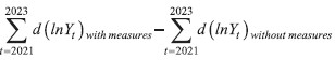 The models used in this calculation are equivalent to the models used in the previous section for measuring the effectiveness of COVID-19 fiscal measures. Drawing on those models, we now made a forecast of the unemployment rate until 2020:Q4. After that, we transform quarterly data for unemployment into annual data by using an average of the Q1-Q4 period for each year. Using the HP filter from annual data, we estimated the natural unemployment rate for both scenarios, with (real values) and without fiscal measures (estimated values), after which we forecasted unemployment rates until 2023 in both scenarios (actual – with fiscal measures and counterfactual – without fiscal measures). Then, using equations (5) and (6), we calculated the contribution of labor to the growth of potential output every year. Finally, we compared the contributions of both scenarios for the period from 2021 to 2023 by simply summing values for the situation with fiscal measures and then deducting from it summed values of the situation without fiscal measures. Calculation 6 was done by equation (6), which is based on equation (5), as follows:  | (6) |