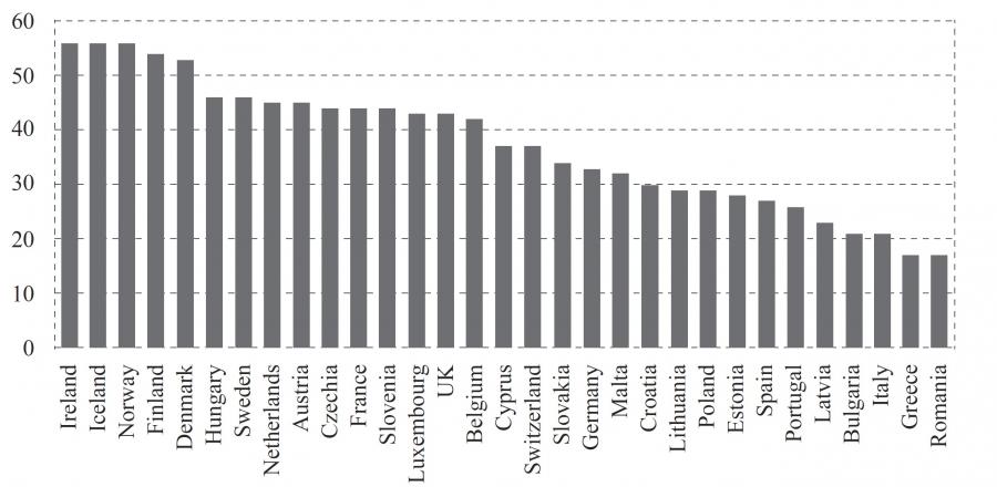 Graph 2 presents the average impact of social transfers for the period 2010-2019 (calculated as the average from each year’s impact). The countries where social transfers have the highest impact on reducing poverty are the following: Ireland, Norway, Iceland, Finland and Denmark. On the other hand, social transfers have the lowest impact in Greece, Romania, Italy, Bulgaria and Portugal. This graph suggests that older EU member states that are located in the North of the continent seem to have better performance of social transfers, while newer member states that are located in the South seem to have lower social expenditure effectiveness, with some exceptions. In the same time, it should be noted that the countries that have the highest impact are also the countries which have the highest social benefits per capita, while it seems that the countries with the lowest impact are the countries which have the lowest social benefits per capita.