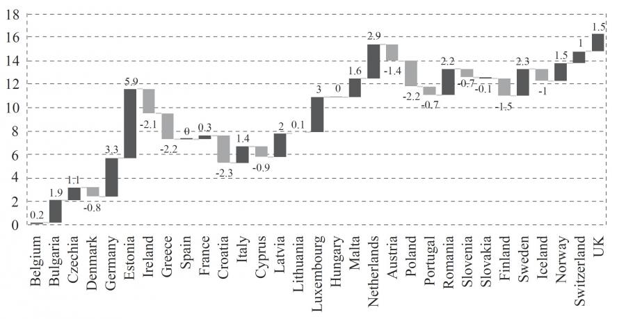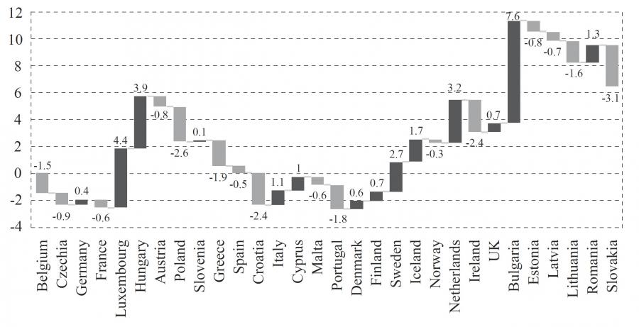 Graph 3 shows the change in the Gini coefficient per country in the year 2019 compared to the year 2010. The highest rise in inequality can be noticed in Bulgaria, Luxembourg, Hungary, Netherlands and Sweden. It seems that the change in poverty has been even greater, with the highest increase in Estonia, Germany, Netherlands, Luxembourg and Sweden all of which are highly developed economies (graph 4).