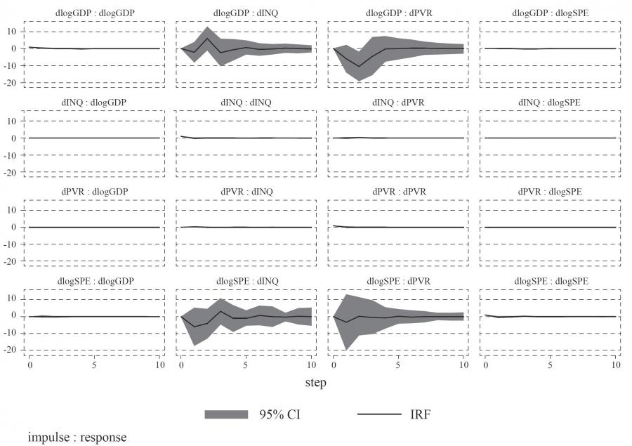 In order to test the results we got from calculating model 1 in this study, we proceed to the calculation of model 2 and model 3. Model 2 is different from the original model 1 in this paper because the variable INQ is dropped and model 3 is different from the original model 1 in this paper because the variable PVR is dropped. It should be noted that we have also performed tests for autocorrelation, heteroscedasticity and pVAR stability and these are available upon request. The results for model 2 show that GDP per capita is statistically significant in explaining the change in poverty and shows a negative relationship (table A3, appendix). These results are confirmed by the panel Granger causality test as presented in table A4 in the appendix. The impulse response function shows that the shock in GDP results in a short-term decline in poverty, which is larger than the impact that social expenditure has on the reduction of poverty. This is in line with the finding of the original model in this paper. The results of variance decomposition (available upon request) confirm that there is only a short-term effect, because the independent variables do not get stronger in explaining the dependent variable over time.