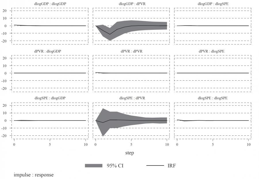 The results of the panel VAR model show three statistically significant slope coefficients in three different equations (table A1, appendix).