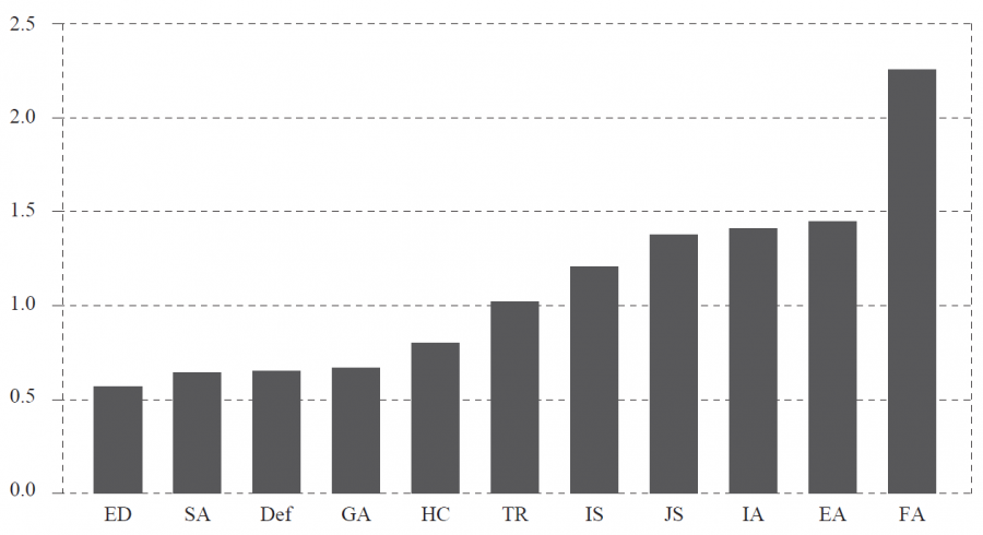 We analyse the following central government departments: 1. General Affairs (GA), 2. Foreign Affairs (FA), 3. Interior Affairs (IA), 4. Economic and Agricultural Affairs (EA), 5. Treasury (TR), 6. Infrastructures (IS), 7. Education (ED), 8. Social Affairs (SA), 9. Justice and Safety (JS), 10. Health Care (HC), 11. Defence (Def).