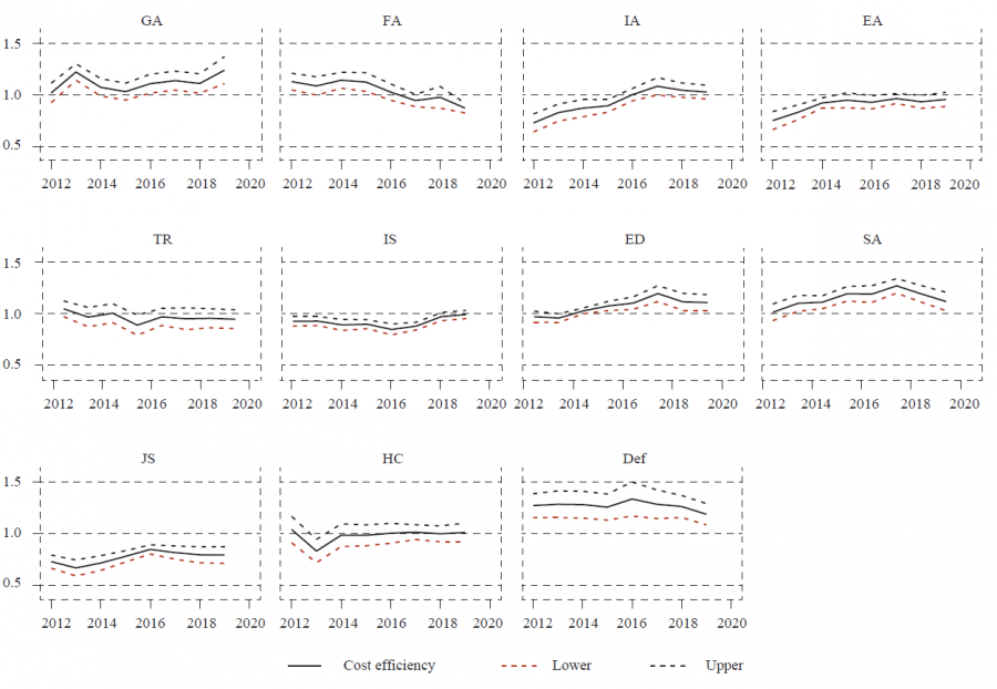 Keywords: central government; productivity; cost efficiency; efficiency determinants; technical change; cost function; scaling property; bureaucracy