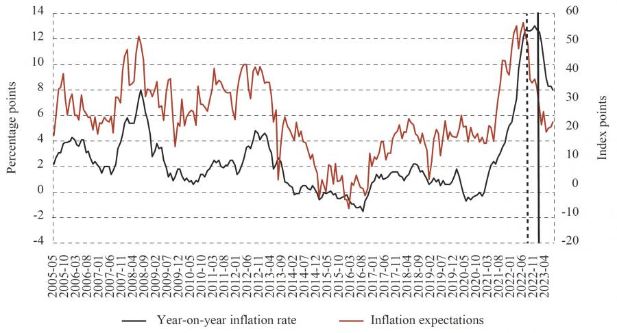 prices). Vertical full line corresponds to January 2023 (euro changeover). Inflation expectations
