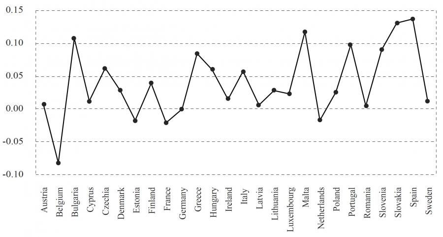 ASCM chooses donor weights that optimize pre-treatment fit. For brevity, we do not report the full set of results, but provide only the average obtained country weights in figure 2. The highest weights are obtained for Spain (0.136), Slovakia (0.131), Malta (0.117), Portugal (0.0979), and Slovenia (0.090). These are either Mediterranean countries with comparable tourism-oriented economies, or Central and Eastern European post-transition countries that had similar historical, politico-economic and institutional trajectories as Croatia.