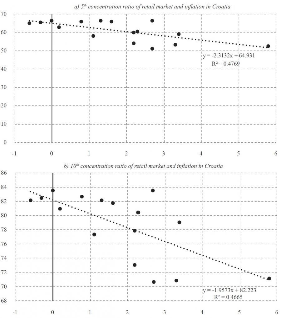 As expected, figure 4 detects a rather strong negative correlation between market concentration and inflation. The assessed data is not restricted to the euro changeover period, and these scatter plots should not be interpreted as nothing more than correlations. Nevertheless, if we were to formulate policy implications from this analysis, they would certainly include market competition and ensuring effective antitrust regulations. In such circumstances, consumers have the opportunity to penalize price manipulations and malpractice of any kind by changing retailers without significant switching costs. Mužić and Pufnik ( 2022), as well as Falagiarda et al. ( 2023) also highlight competition as a key factor that should contribute to inflation stabilization after the euro conversion in Croatia.