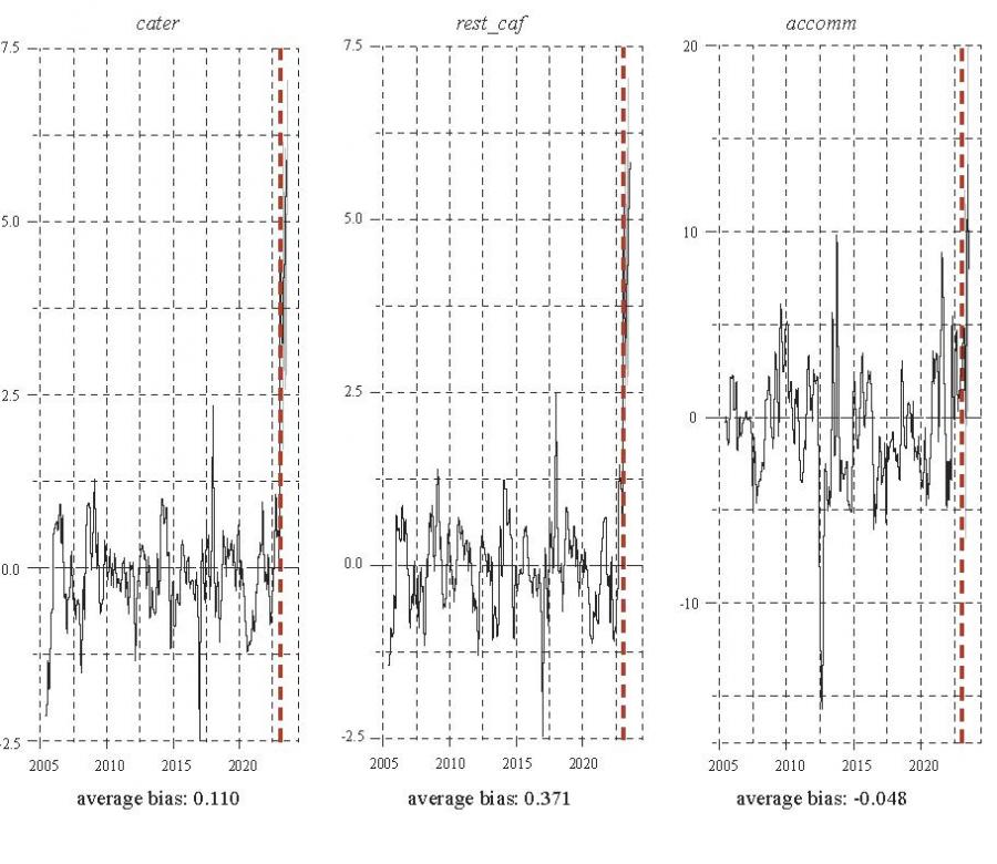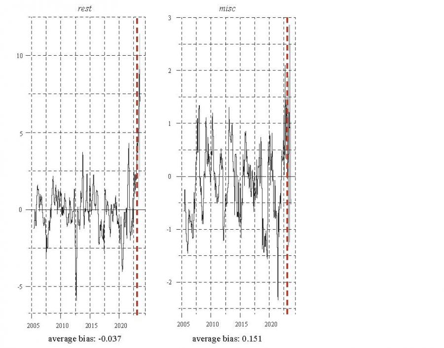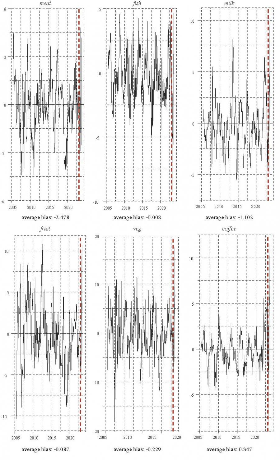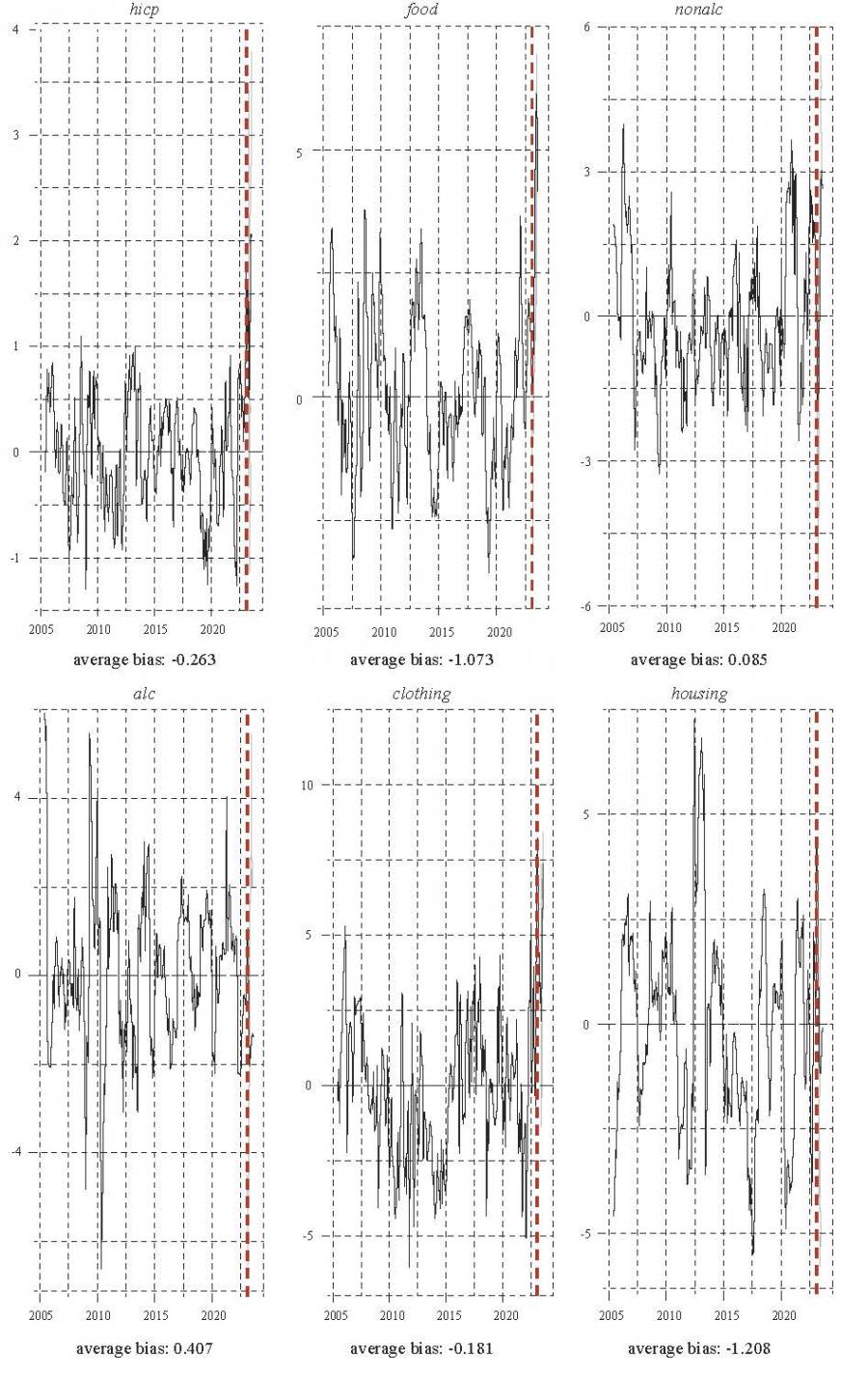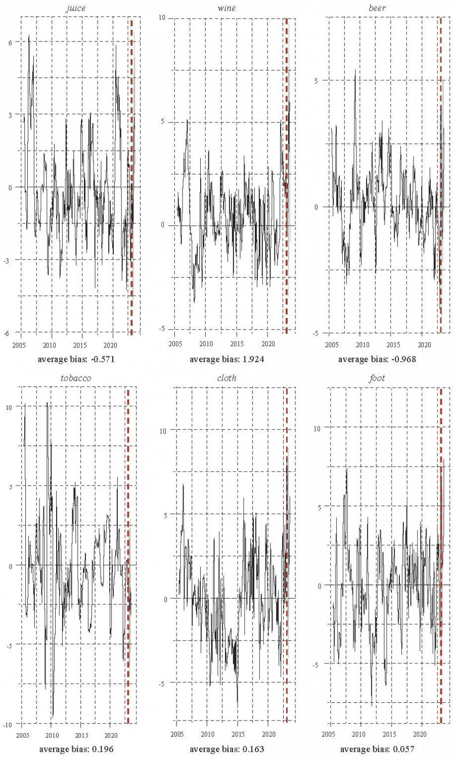 Table 6 reveals that the prices of coffee, wine, clothing, footwear, catering, restaurants and cafés, and accommodation have indeed reacted the most intensively to the euro changeover. However, the average biases reported in figure A2 suggest that most of lower-level ECOICOP inferences are to be taken with caution since the obtained fit is largely questionable. The official EU statistics hardly provides decent auxiliary covariates that are able to capture the dynamics of inflation at such low level of aggregation.