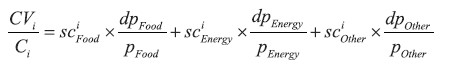 The main analysis in the paper is based on three consumption categories: food, energy, and other (all goods and services excluding food and energy) and applied to all households and to various household groups, defined and aggregated based on relevant socioeconomic characteristics such as income. The total CV for household group i is hence computed as: