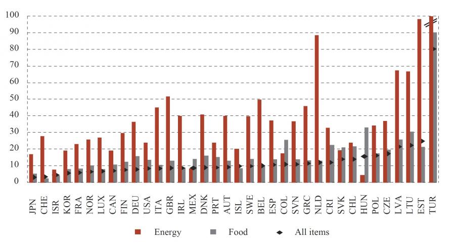 - Rising food prices weigh less than rising energy prices on the purchasing power of the average household. Mexico is an exception given the high share of food in the consumption basket and the relatively mild increase in energy prices over the period.