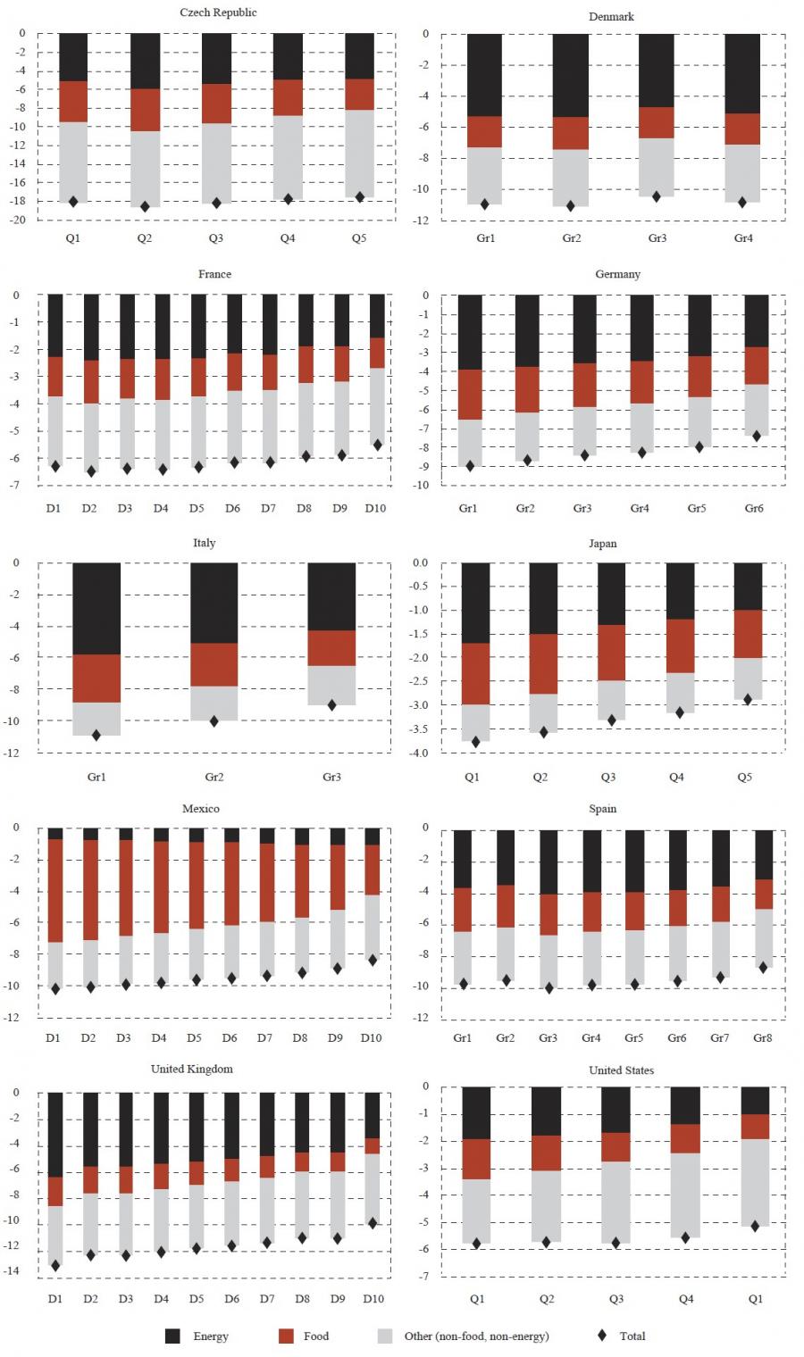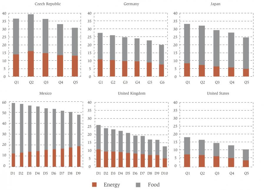 To introduce the exercise, figure 2 reports expenditure shares on energy and food across the household income distribution for the Czech Republic, Germany, Japan, Mexico, the United Kingdom, and the United States. 7 The main insights are: - Households devote a significant share of their spending to food and energy, and this share declines with increasing income level. Their combined spending share ranges from more than 30 per cent at the bottom to less than 15 per cent at the top of the income distribution, across the advanced economies covered here, yet with large cross-country differences within that broad spectrum.