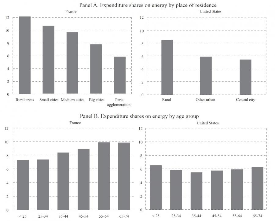 Differences in energy spending are more pronounced across place of residence than across households’ incomes. This is illustrated in panel A of figure 3 with France and the United States. For example in France, people living in rural areas devote around 12 per cent of their budget to energy, more than twice as much as people living in the Paris agglomeration. It is often the case that people living in metropolitan areas have diverse commuting and mobility options, including public transportation, walking, biking, and while people living in rural or non-central areas may have no other option than driving a personal car (for example to go to work or the doctor). Differences in energy spending by age are less systematic across countries than they are by income and place of residence: taking again France and the United States as examples, panel B of figure 3 shows that the share of spending devoted to energy increases almost monotonically with age in France, but not in the United States. 8