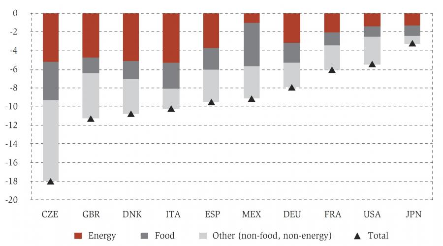 - The effect of “non-food-non-energy” prices on the average household’s purchasing power is relatively higher in countries like the Czech Republic and the United States, reflecting the fact that inflation in these countries was more broad-based.