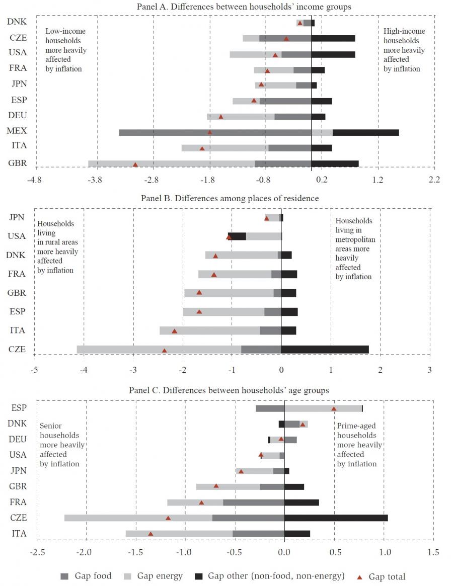 Inflation has a greater impact on low than high-income households, but with marked differences across countries. Nevertheless, such differences do not appear to be strongly correlated with the level of inflation in the country. The gap between low and high-income households is the largest in the United Kingdom while it is almost absent in the Czech Republic and Denmark despite similar or even higher headline inflation over the period covered.
