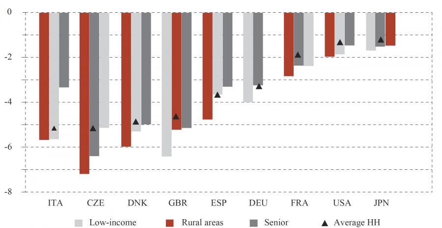 - Senior households tend to experience milder purchasing power losses than low-income and rural households, in particular in Italy and in the United States.