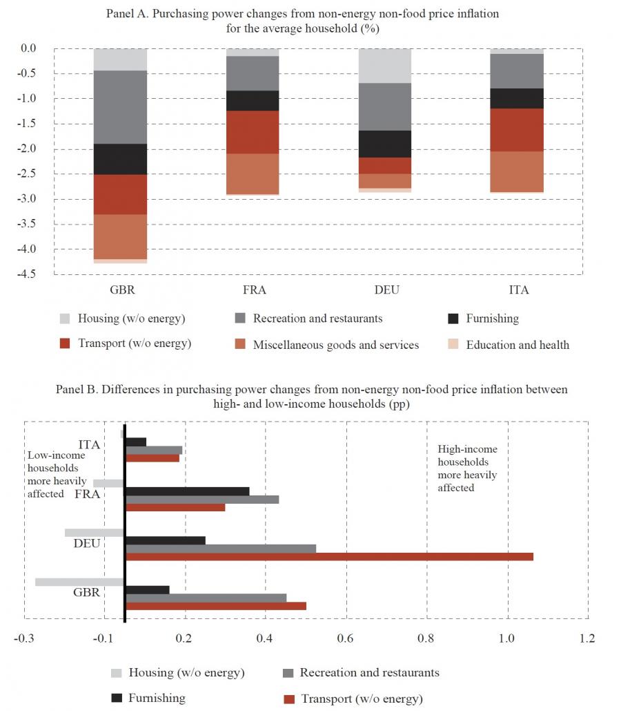 Average household effects (figure 7, panel A) - Rising prices of recreation and restaurants and of non-energy categories of transport goods and services (e.g., buying a car or an airline ticket) are major drivers of purchasing power losses for the average household across the sample of countries considered.