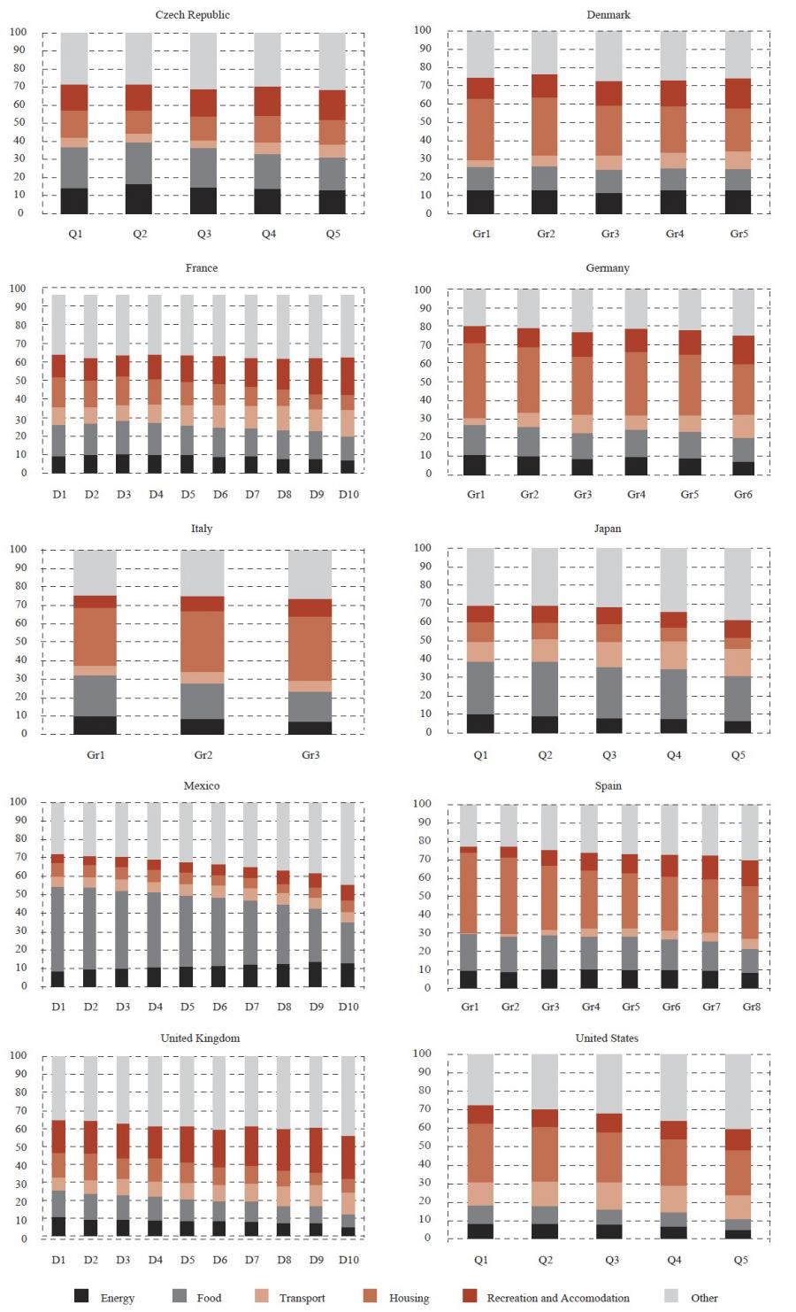 Note: Distribution based on household income (see annex for country-specific income measurement). Energy refers to energy from housing and private transportation. Food includes food and non-alcoholic beverages, with the exception of Mexico, where it also includes alcoholic beverages consumed at home. When possible, expenditure shares are shown by income deciles (for Mexico and the United Kingdom) or quintiles (the Czech Republic, Japan, United States). In the case of Germany, the data can only be obtained by the income groups defined by DEStatis (indicated as G1,…G6). Source: National HBS sources (see annex).