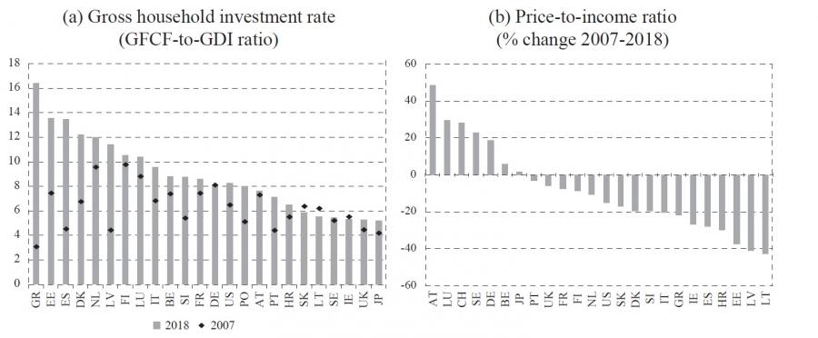 8 There are some patterns observed when considering the investment rate and prices together. We can observe some countries such as Spain and Greece, where both investment rate and price-to-income ratio have fallen, indicating a lack of demand in the market. By contrast, Germany, Japan and Austria have reached investment rates similar to pre-crisis levels and increases in prices with respect to their disposable incomes.