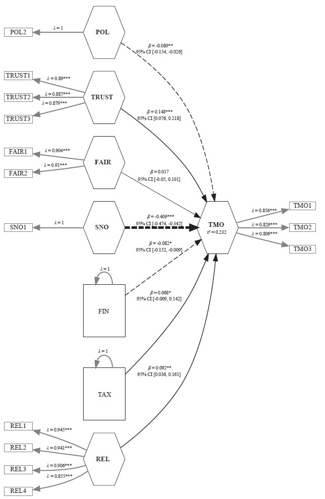 All path coefficients are statistically significant (table 6, figure 1), with the exception of perceived fairness (FAIR). Trust in institutions (TRUST) and social norms (SNO) are statistically significant at a 1% significance level, while politics (POL) and religion (REL) are significant at a 5% significance level. Financial knowledge (FIN) and tax knowledge (TAX) are statistically significant at a significance level of 10%. Religion (REL), trust in institutions (TRUST) and tax knowledge (TAX) have a positive influence on tax morale (TMO). This means that higher trust in institutions (TRUST), higher religious sentiment (REL) and higher tax knowledge (TAX) of students positively influence tax morale among them. The path coefficient for trust in institutions (0.148) indicates that, ceteris paribus, tax morale increases by 0.148 standard deviation units when trust in institutions increases by one standard deviation unit.