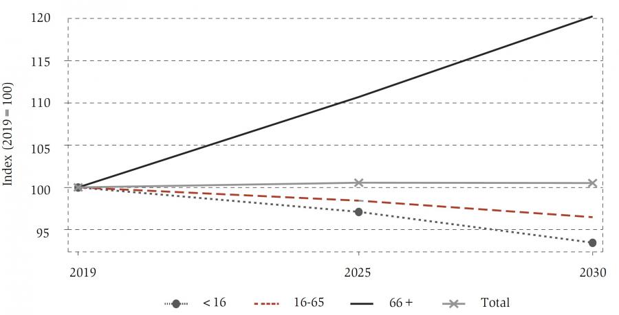 Population projections data, summarized in table A1 in the appendix, show that the total EU-27 population will increase by 3 million between 2019 and 2030, when it will reach 449 million. Sixteen member states will experience an increase in the total population between 2019 and 2030, while 11 (Bulgaria, Croatia, Greece, Hungary, Italy, Lithuania, Latvia, Poland, Portugal, Romania and Slovakia) will experience a population reduction. In relative terms, Latvia will experience the largest reduction in the overall population (-11%), and Malta the largest increase (+19%).