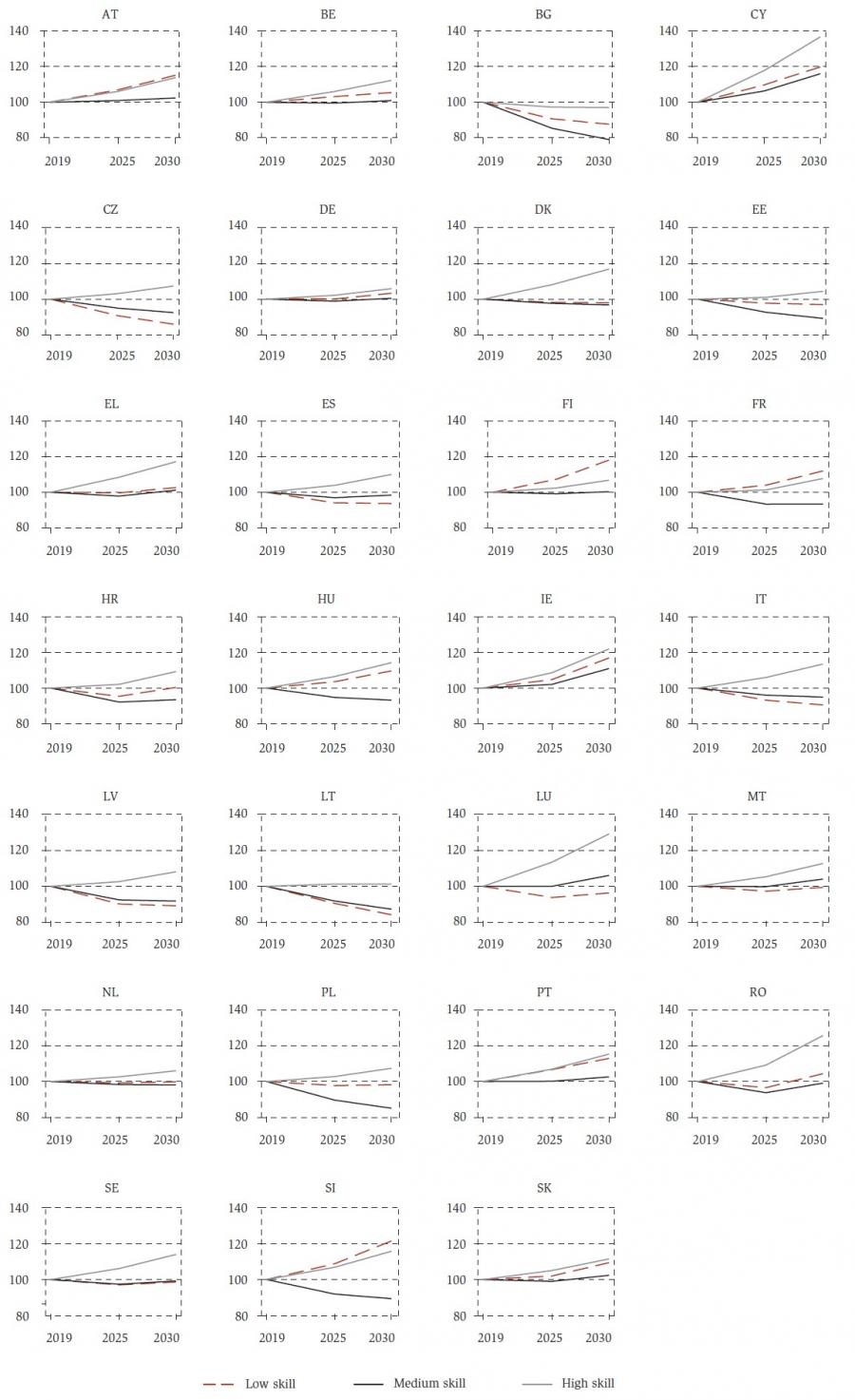 In terms of skill composition, figure 4 shows that three general patterns can be identified across EU member states. In most countries, high-skill jobs will experience the highest (or least negative) growth rate, followed by low-skill jobs and medium-skill jobs. In Austria, Finland, France and Slovenia low-skill jobs will grow the most, followed by high-skill jobs and medium-skill jobs. In eight countries – Czechia, Spain, Italy, Latvia, Lithuania, Luxembourg Malta and Sweden – high-skill jobs will grow the most, followed by medium-skill and low-skill jobs. It should be noted that the number of high-skill jobs is expected to increase in all member states, with the exception of Bulgaria. The exception can be explained with the fall in the total number of jobs (and employment rates) forecasted for this country. About half of the EU member states will experience a reduction in the absolute number of medium-skill jobs. Seven member states will experience a reduction in the number of low-skill jobs (see table A2 in the appendix for the share of each skill group out of the total jobs) 9.