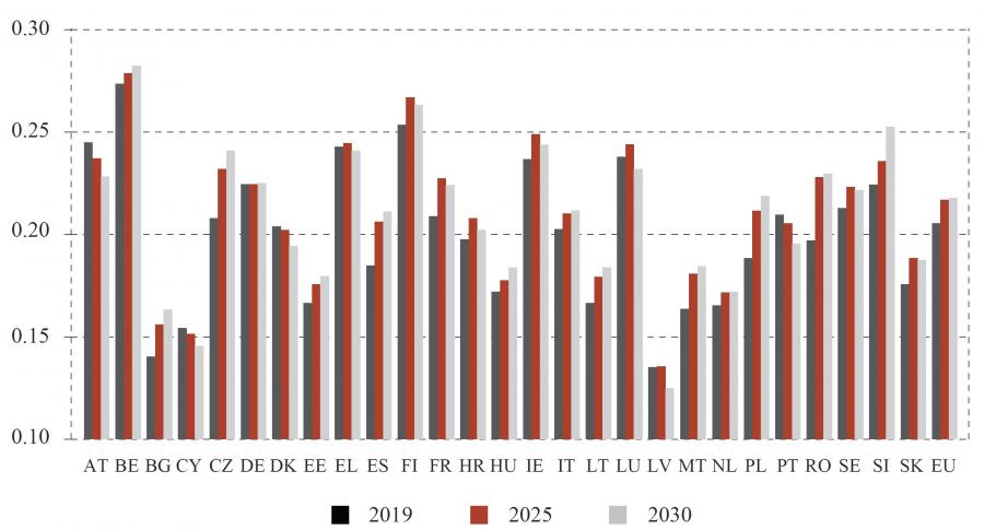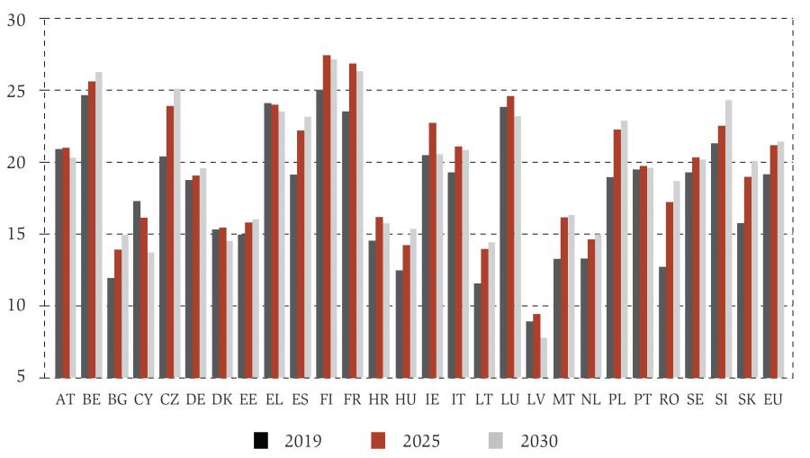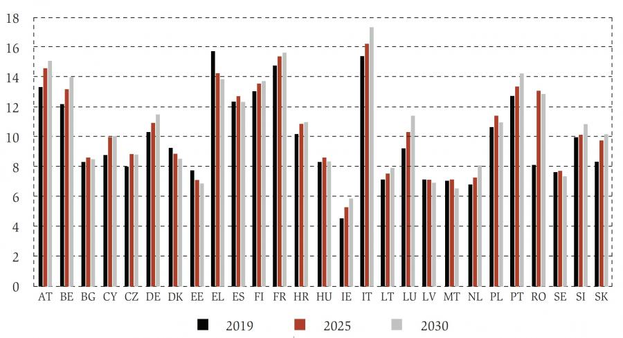 However, ageing will affect EU countries differently (see figure A1 in the appendix), with Ireland and Luxembourg experiencing an increase in the number of over-65s close to 40%. Bulgaria will experience the smallest increase in the number of those over 65. In terms of population share, Italy is expected to have the highest share of over-65s by 2030 (25.1%, +3.7 p.p. compared to 2019); Ireland the smallest share (16%).