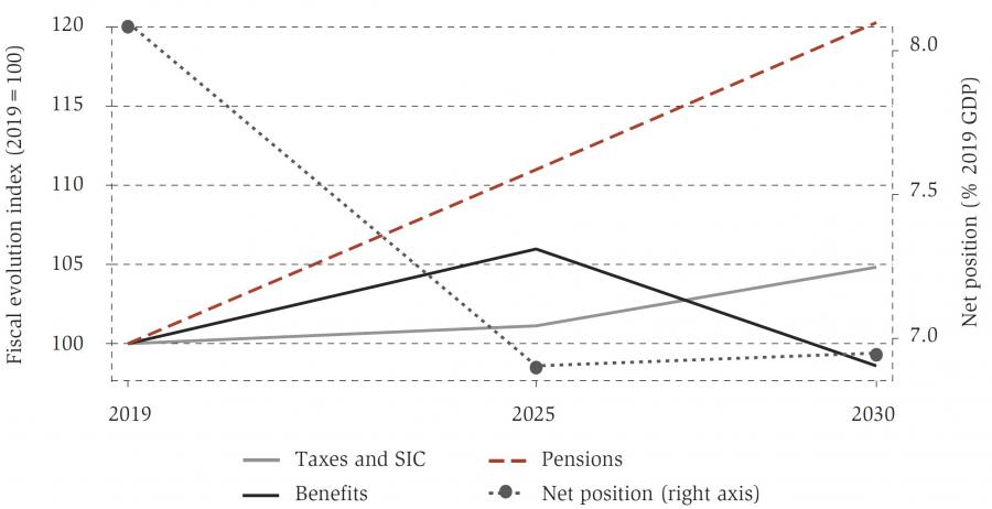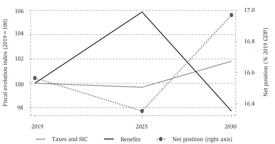 The results show that changes in these fiscal aggregates are strongly driven by population ageing, which is expected to lead to a strong increase in pension expenditures. In order to be able to leave aside the effect of population ageing, figure 7 reports the fiscal aggregates related only to the working age population, defined as individuals aged between 15 and 64 and not receiving pensions. Taxes and SIC are expected to stay stable between 2019 and 2025, but then increase by about 5% till 2030; social benefits are expected to first increase by about 6% in 2025 and then fall to a lower level than observed in 2019. The COVID-19 related increase in unemployment contributes substantially to the pattern observed.