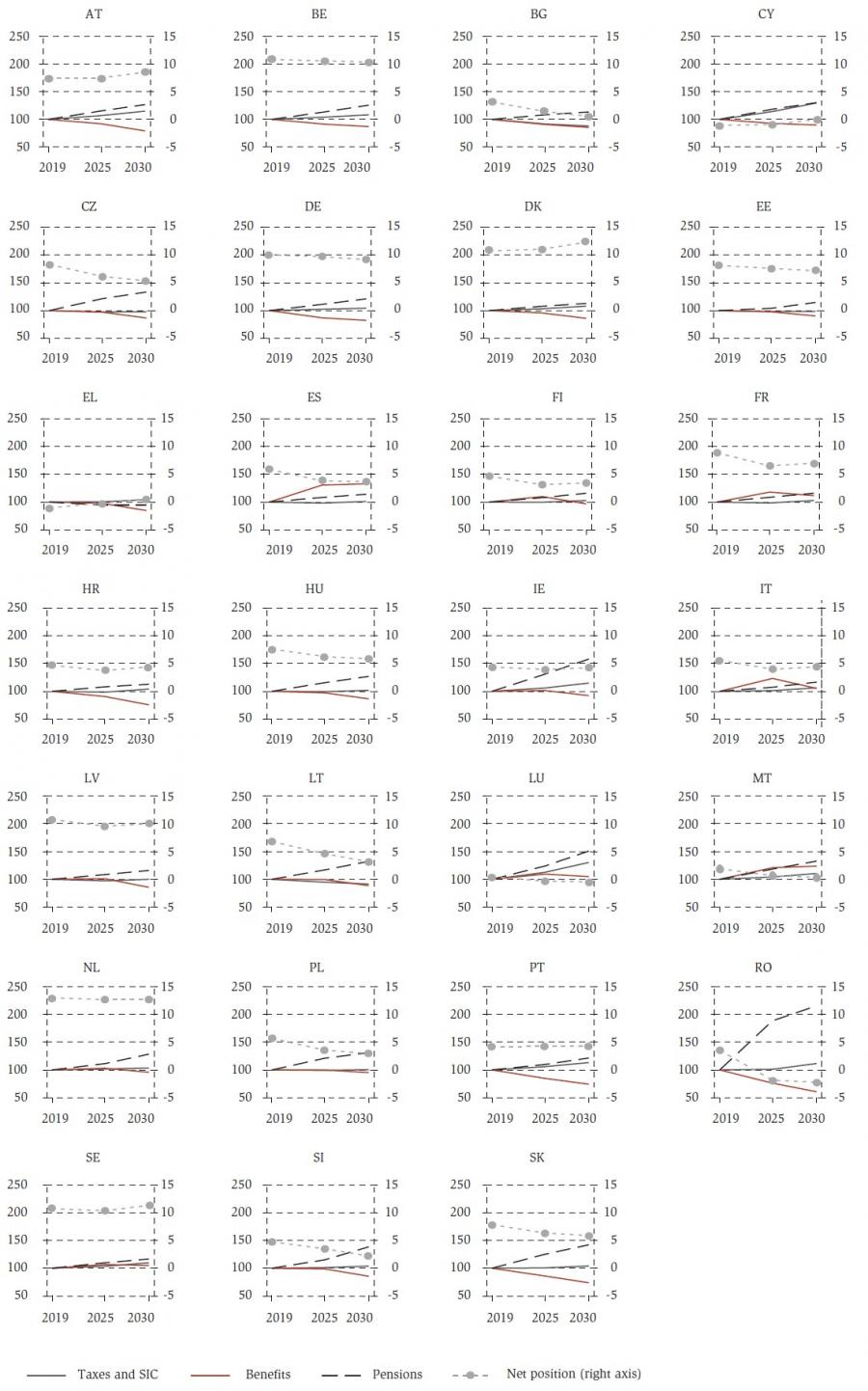 Comparing 2019 and 2030, expenditure on social benefits is expected to decrease in most member states except for Spain, France, Italy, Malta and, to a lesser extent, Sweden. Increases in benefit expenditures are observed in several member states when 2025 is compared to 2019. Results are mostly driven by the unfavourable impact of COVID-19 on unemployment, in combination with potential increases in family benefits due to an increase in young cohorts in Malta and Luxembourg. Figure A2 in the appendix, reports fiscal aggregates for the active population. As expected, the government position for the active population is substantially higher than for the entire population and it shows a stable or improving pattern in most of the countries.