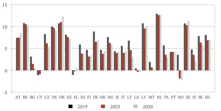 Consequently, the net budgetary position of governments with respect to the working age population is expected to first drop slightly from 16.6% to 16.4% of 2019 EU GDP between 2019 and 2025, but then increase up to 17.0% of 2019 EU GDP by 2030. The finding confirms the importance of population ageing for the future of public finances of EU member states.