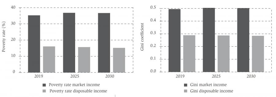 To assess the impact of the tax-benefit system on poverty risk and inequality, we look at the changes in standard indicators before and after government intervention (market income vs. disposable income). Figure 13 highlights the capacity of the tax-benefit systems of each EU member state to reduce poverty risks. The poverty reduction index is computed as the difference between the at-risk-of poverty rates related to market income and the at-risk-of poverty rates related to disposable income. We find that the tax-benefit systems (as of 2019, assuming no fiscal policy changes) absorb a substantial (and in most countries growing) part of the expected increase in poverty risk during the next years. This is due to the features of the tax-benefit systems, such as progressivity of taxes, means-tested benefits, complex interaction of the different elements of the systems, etc. Only Austria, Cyprus, Denmark, Greece and Latvia are expected to have a decrease in the poverty reducing property of their tax-benefit systems.