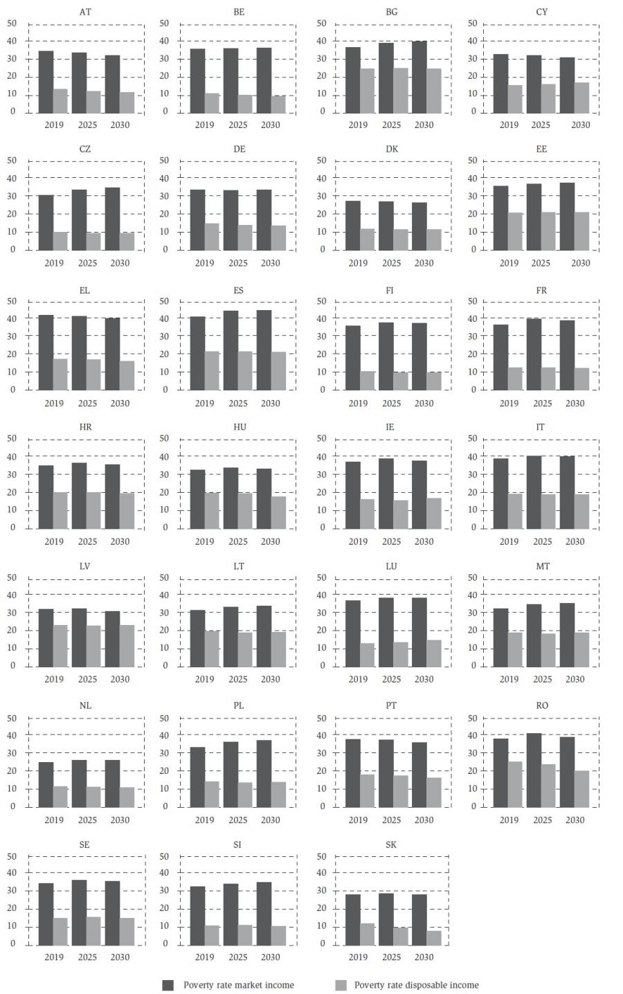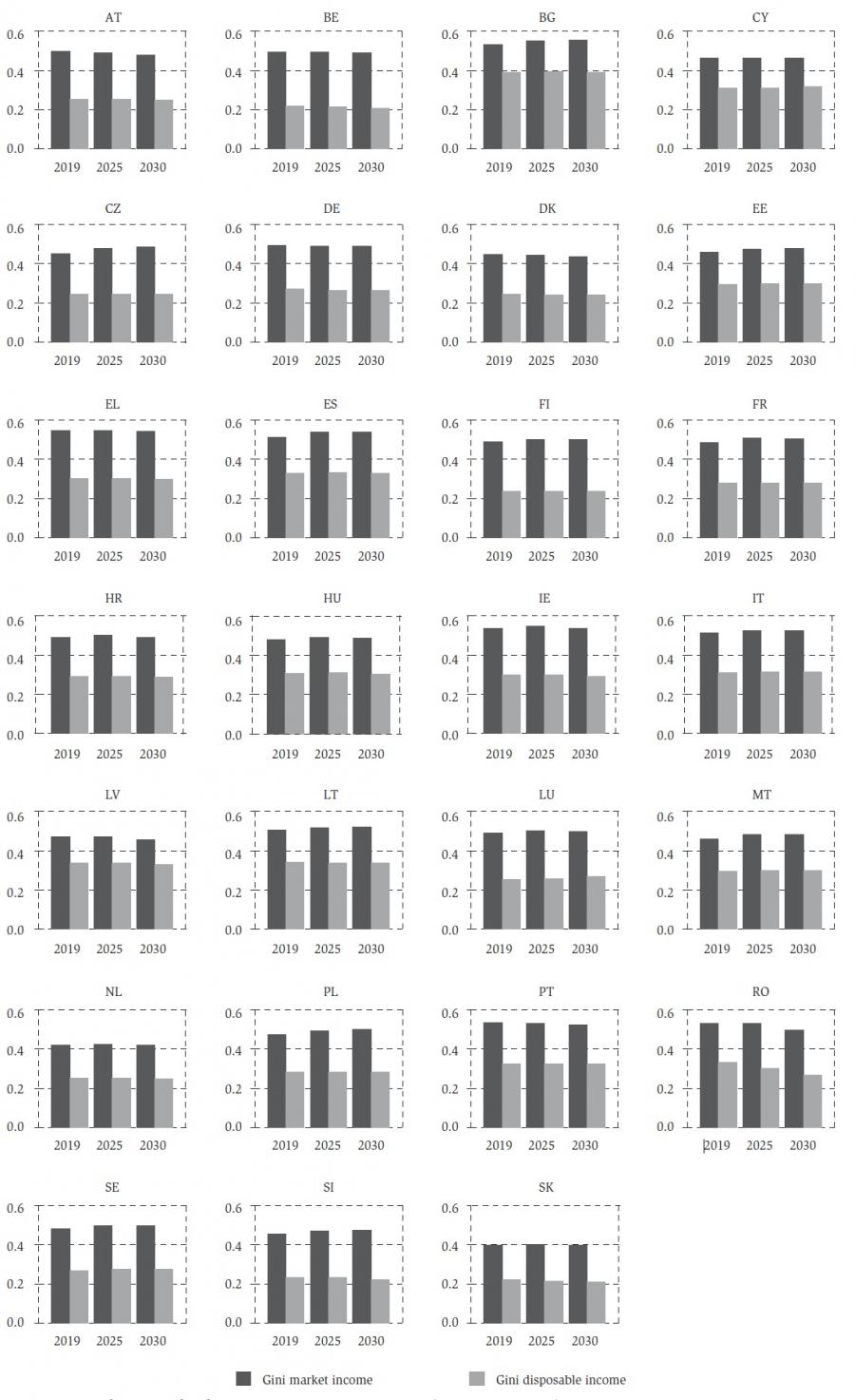 The Gini coefficient, reported in figure 12 for each member state, show consistent results: the change in the distribution of market income is heterogeneous. While the Gini coefficients on disposable income usually indicate either a stable or a more equal income distribution in 2030 than in 2019. In particular, Slovakia and Romania are expected to experience a reduction in Gini coefficients on disposable income above 1 percentage point. On the other hand, in Luxembourg, Malta and Cyprus we observe an increase in the Gini-coefficient of more than 0.5 percentage point.
