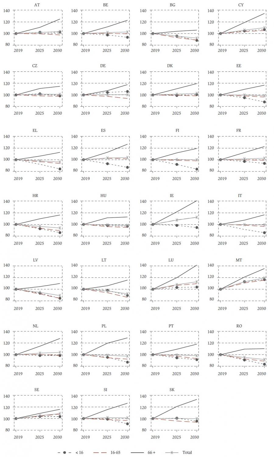 The population projections by EUROSTAT provide estimates of future changes in the size and structure of the EU member states’ populations. To produce the projections, EUROSTAT assumes increasing fertility rates, decreasing mortality rates and positive net migration in most countries in their baseline scenario (EUROPOP2019). For this study, we use the forecast data up to 2030 for a population in the age groups of 0-15 years, 16-40, 41-65 and 65+. No changes were made to the baseline population projections as a result of the COVID-19 pandemic.