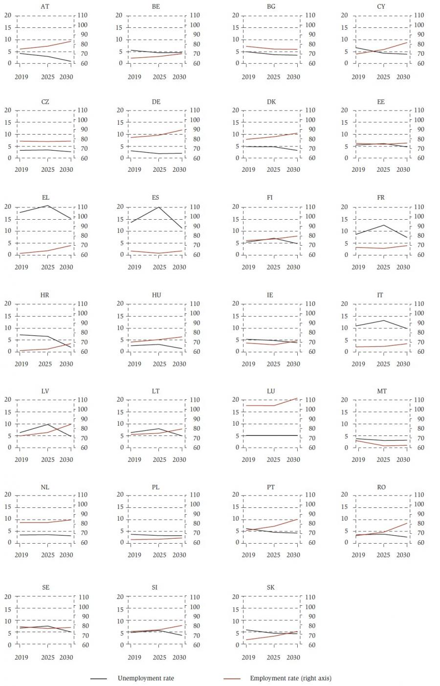 Figure A1Demographic projections across EU member states, 2019-2030 (2019 = 100) DISPLAY Figure Figure A2Employment rate (right hand scale) and unamployment rate (left hand scale) projections (in %) accross EU member states, 2019-2030 DISPLAY Figure Table A1Population projections, years 2019-2030 (in %) DISPLAY Table Table A2Skill and total jobs projections, years 2019-2030 (in %) DISPLAY Table