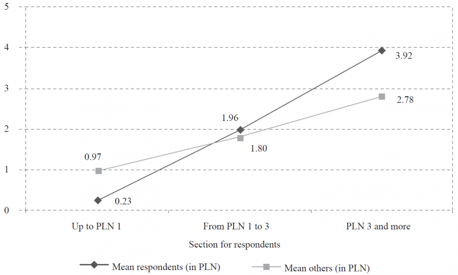 In the article it has also been assessed whether winners who declare to share higher amounts with the losers think that others will also be more generous. For this purpose, the respondents were divided into three ranges in accordance with declared amounts: different for amounts shared with one loser (up to PLN 1, from PLN 1 to 3, over PLN 3) and different for amounts for two losers (up to PLN 1, from PLN 1 to 5, over PLN 5) due to lower amounts declared for one loser and higher for two losers. Next, the average amounts shared by the respondents and other group members in particular ranges were compared. As a result of Kruskal-Wallis tests where mean variable levels were compared, it may be concluded that there are statistically significant differences among them. Similar regularities may be observed when comparing the means (graphs 2 and 3).
